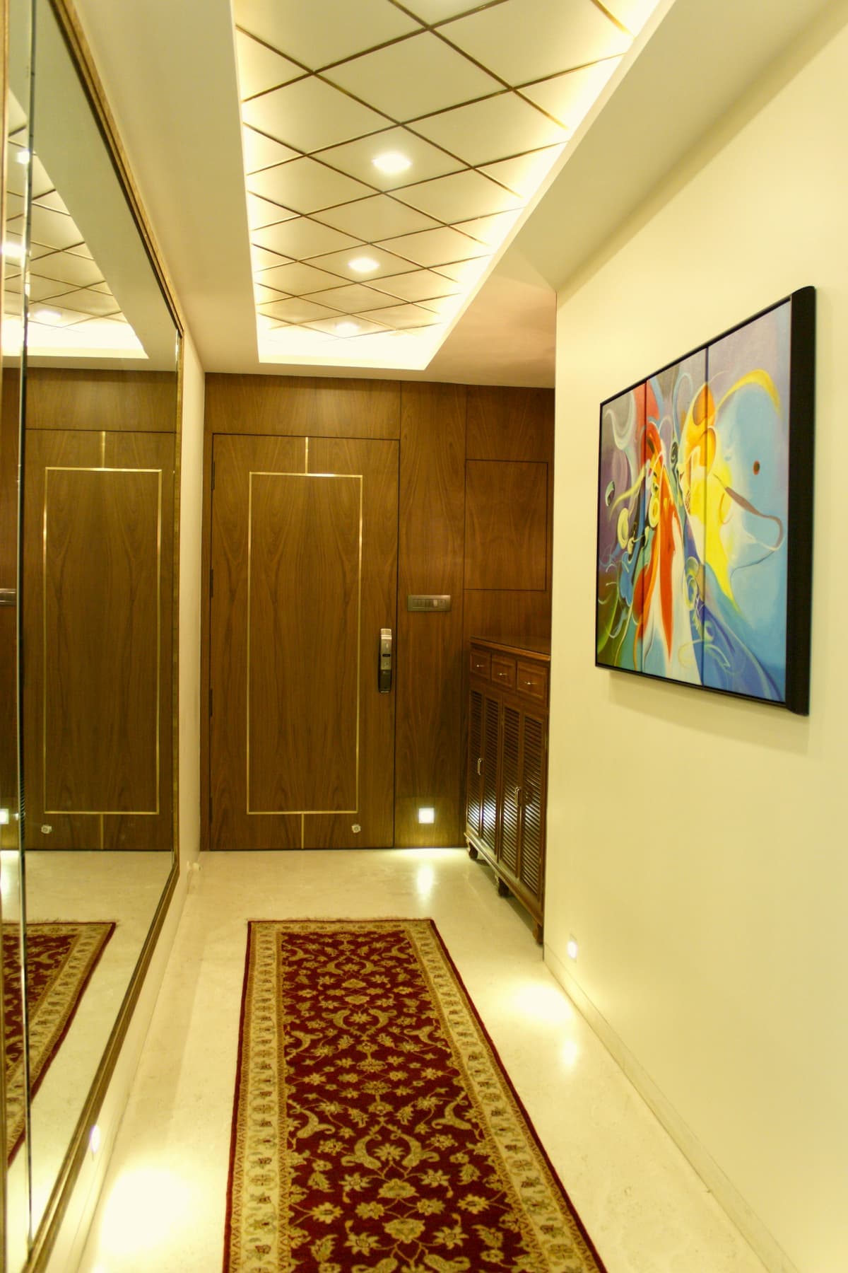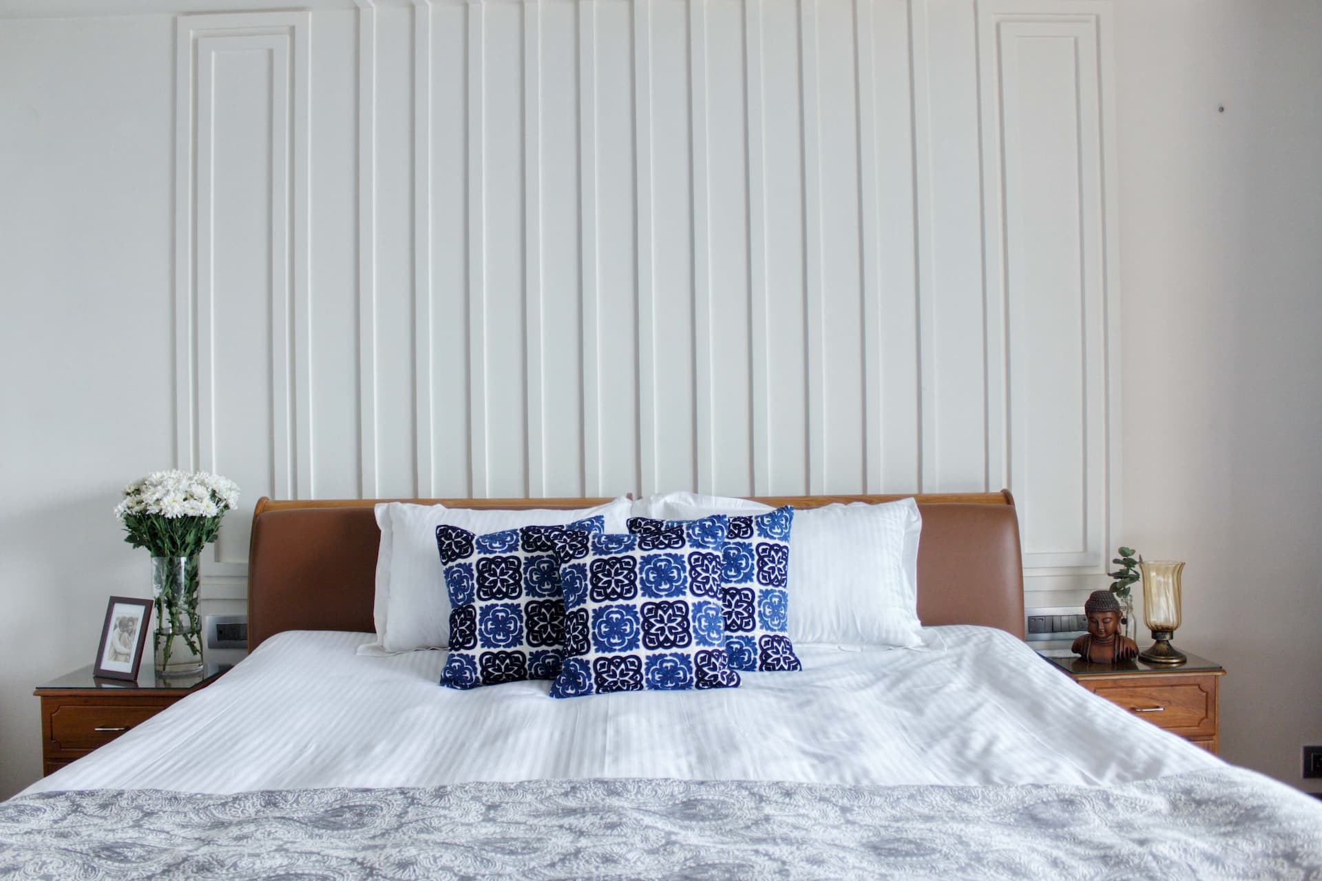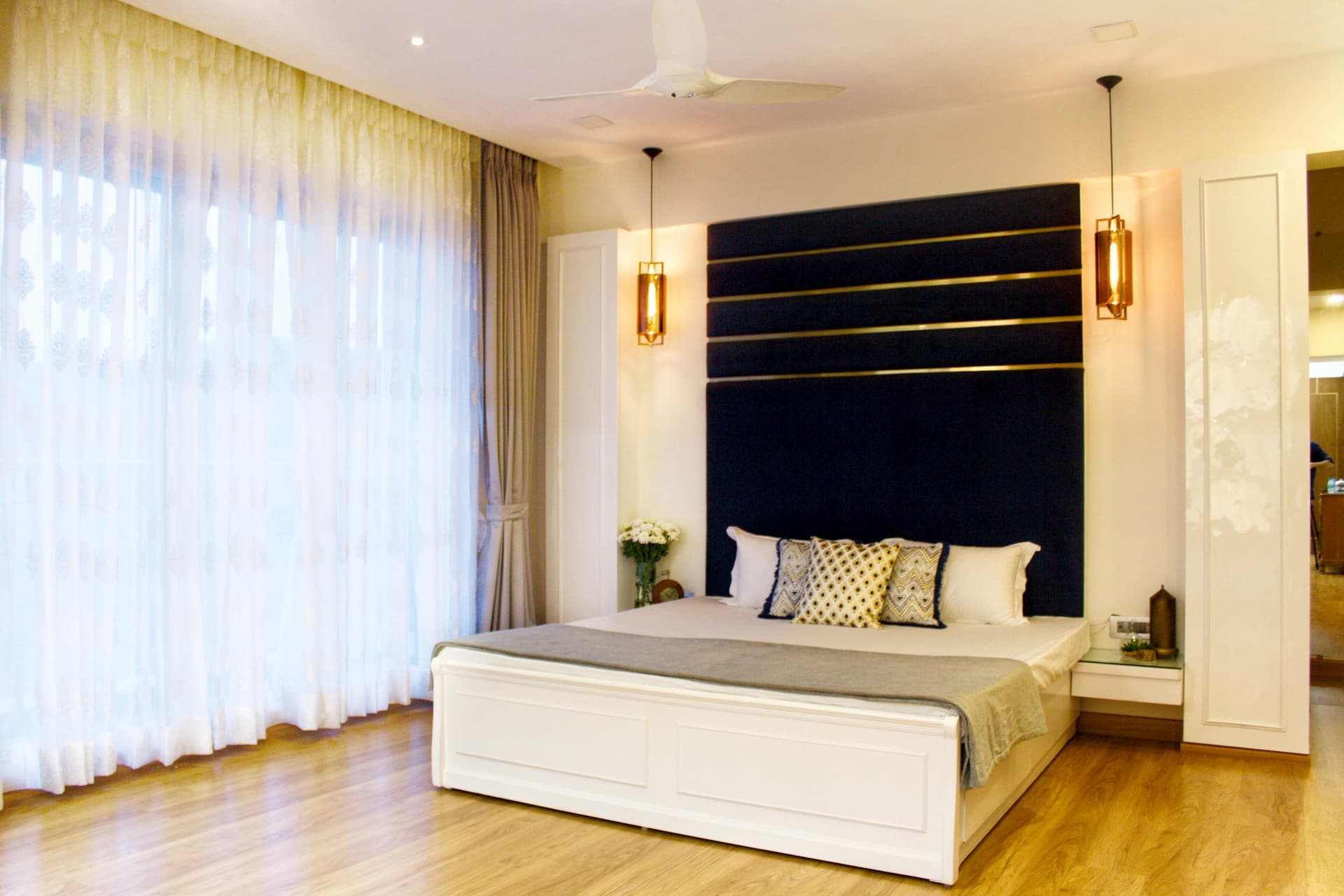 fun, as this bedroom does with its brass inserts on velvety headboard of bed and on